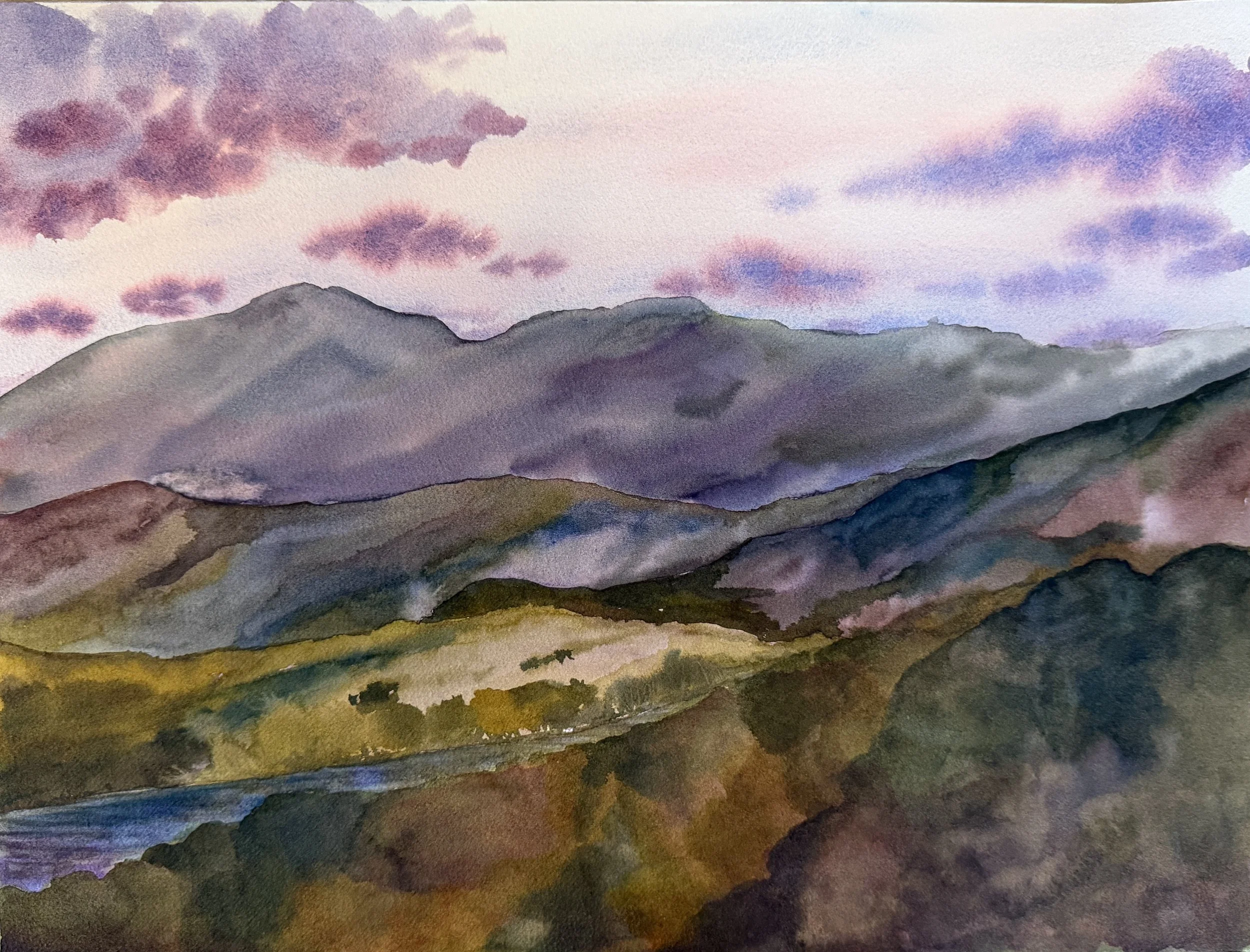 Her husband encouraged her to try her hand at painting and her work quickly moved from acrylic to watercolor during the pandemic. She couldn’t learn enough, tried a little of everything, the journey being the point of it all, always pushing to learn, improve and discover. She draws inspiration from the stunning sunsets and sunrises of the Appalachian Mountains, the wildlife found there, and her favorite dog in the world, Chancho.