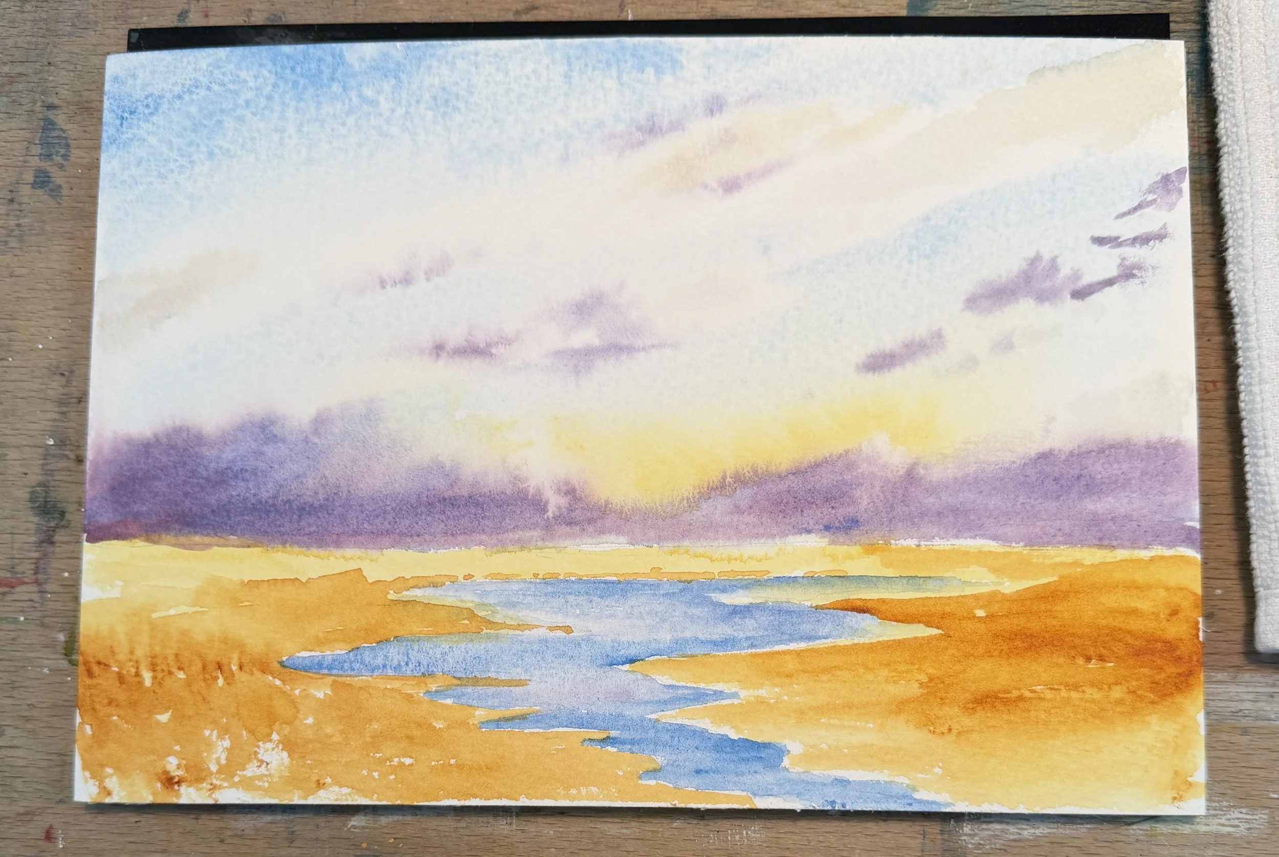 Comparing the study with the original, I feel like it is almost there. The sky needs a tad more pink and yellow, the water needs some shadowing and then I add one more layer of dark to the foreground.