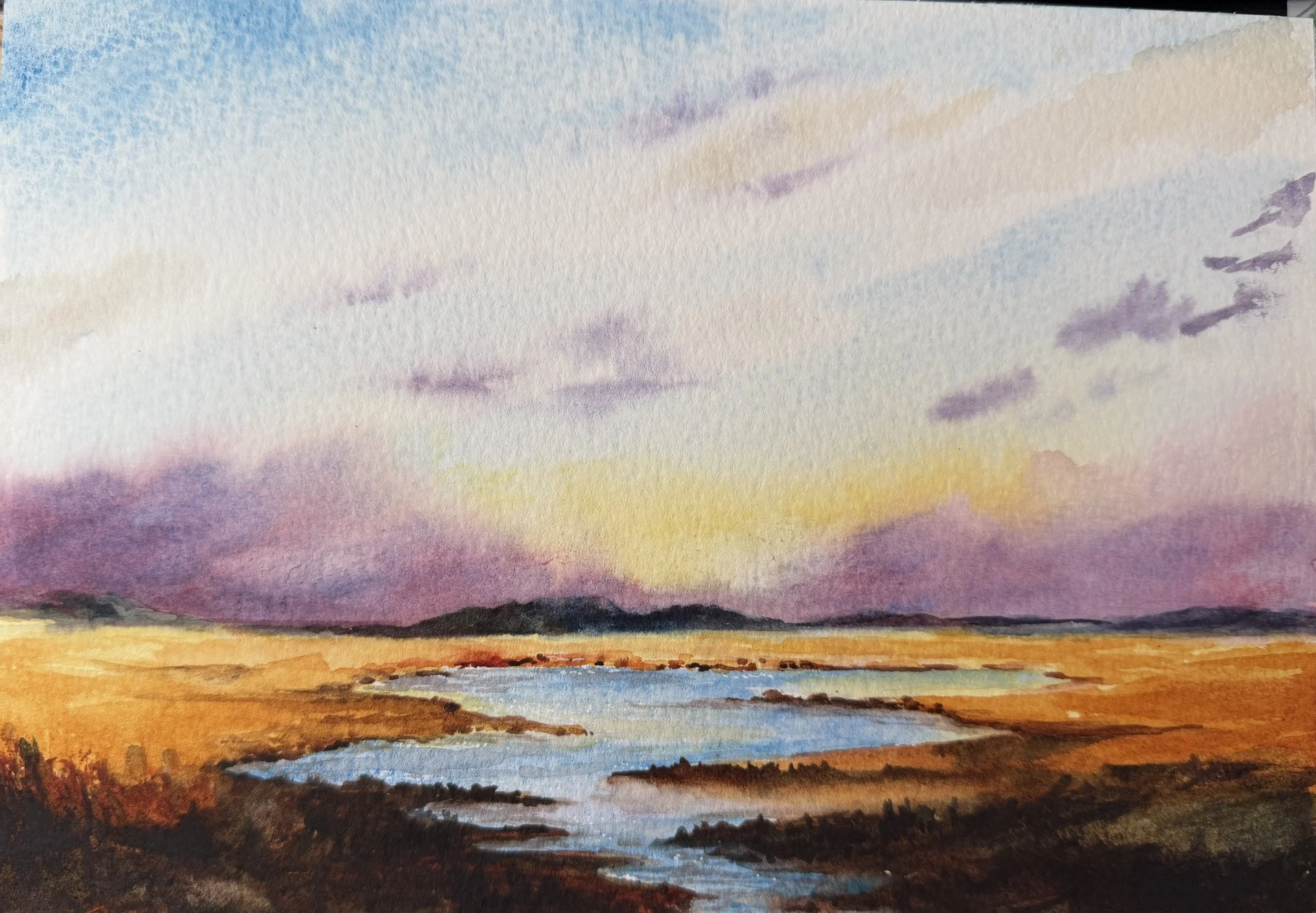 For the wam glow, again, I used quin gold (this has to be a favorite color!) varying my paint thickness and brush strokes to create texture. For the trees in the horizon, I used Indantherene blue, violet, and deep sap green. I lifted areas, softened others to mimic the original. All of those soft lines are really easy to replicate in watercolor! For the darks in the foreground, I used indian red, quin sienna, VanDyke brown and some neutral tint. From a distance, the original looks like one big dark blob at the bottom, but as you inspect further, there are shapes and suggestions of depth and stones or other things. Once again, you want to convey the sense of those things without painting them in by varying the stroke and color you are applying. (I, once again, forgot to document this in between step. UGH)