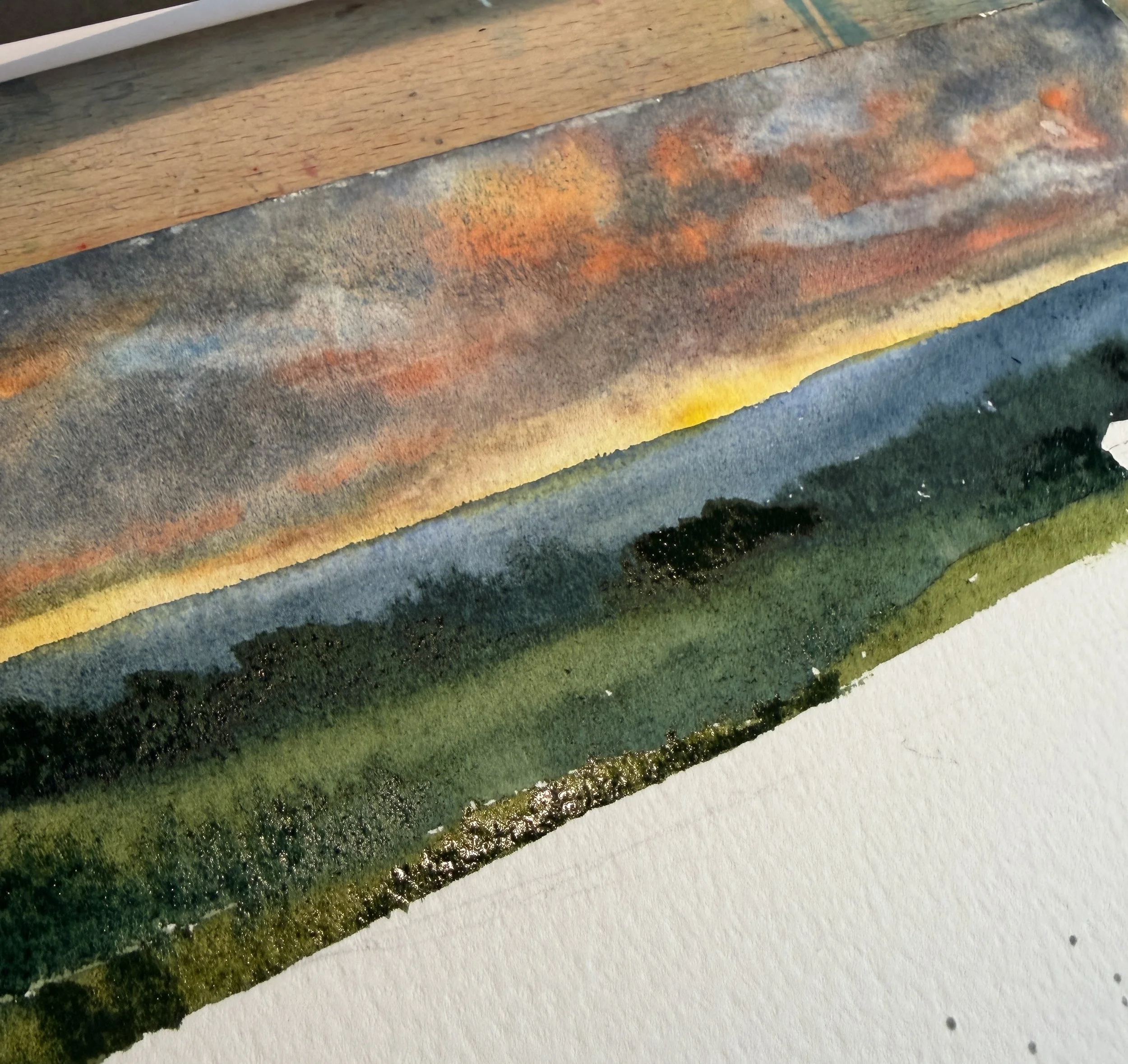 As I add the layers of blues and greens, it’s a constant slight variation of color and tone, some blending together, some hard edges. All of this is why I think that watercolor is a perfect medium for showing that “unseen air”! I’m not using one green or one blue here, but basically just something different mixed up for each layer.