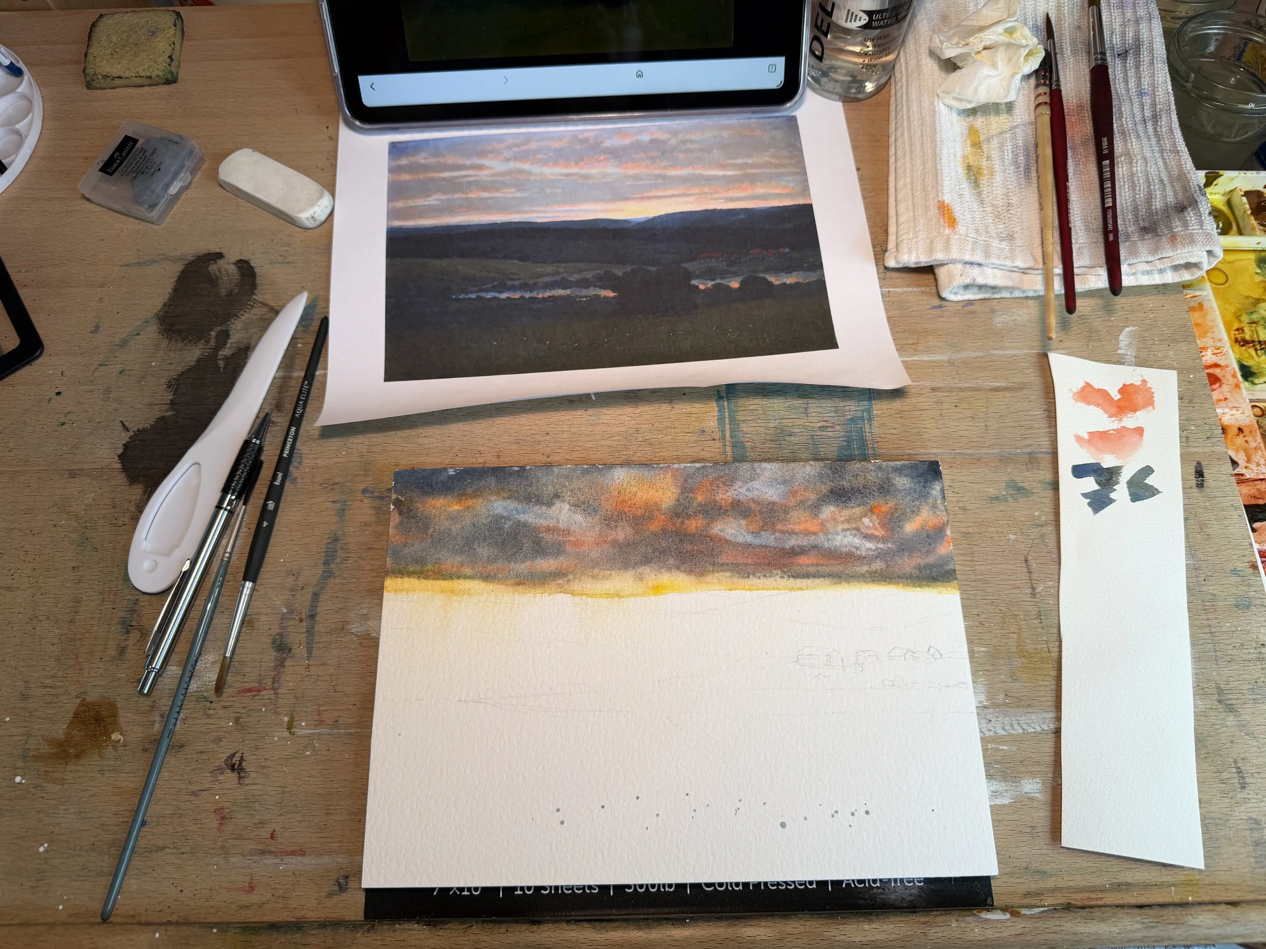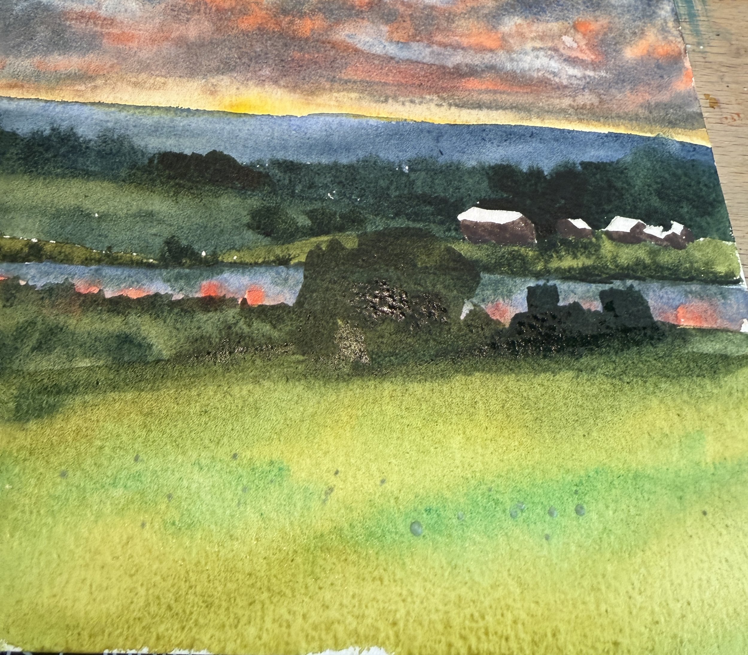 As you can see, I have here my sketch done lightly, a bit of masking fluid in the foreground to add the bright flowers in at the end, and I have painted the beginning of my sunset. What a monumental mess. Entirely too dark and too bright. This is the point where sometimes, you just want to throw the whole thing away and start again. But, I choose to carry on. It might be salvageable with some lifting and some lavender. Coffin’s painting’s sky is so very detailed and in trying to recreate that I missed the mark. I should have probably chosen to make 2 large areas of clouds that were blocks of color. Regardless, we keep moving.