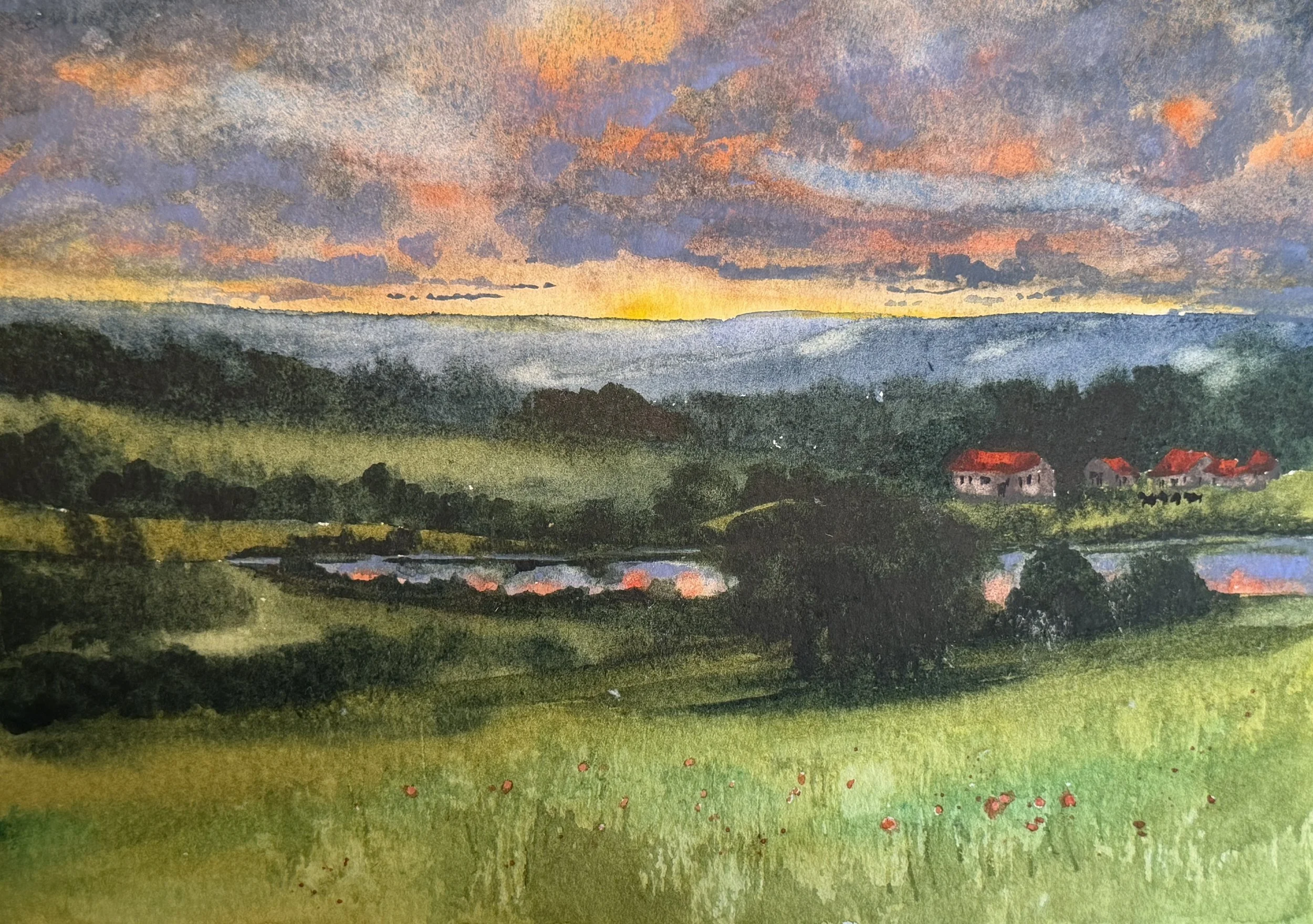 Now that I have a layer over everything down in my first layer. Most of our edges between things are soft, but there are some hard edges we need to soften and some hard edges we need to add. With everything else in, the sky doesn’t look horrible. Maybe it is salvageable after all. I add some texture to the foreground, some red roofs and windows, some wee little cows, some poppies and hit the sky up with the a bit of cerulean and lavender to kick back the color and break it up.