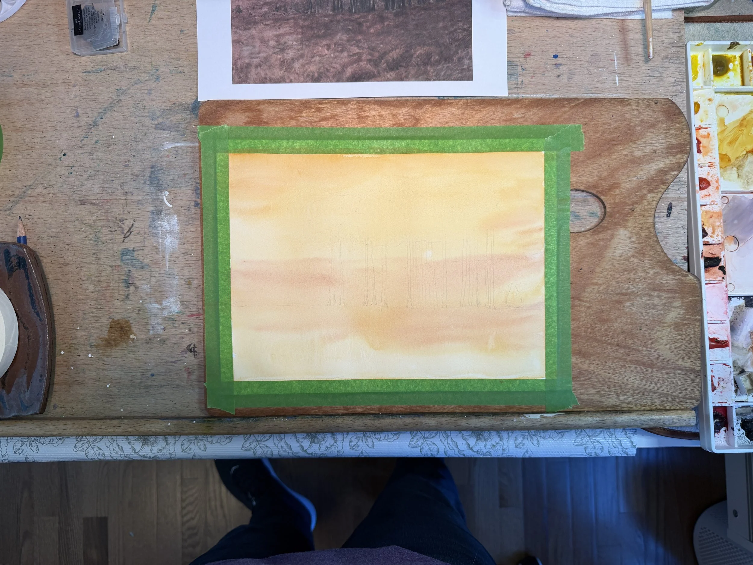 Super simple sketch to start off. My paper is 9×12 Fabriano Artistico which is slightly different w/h ratio than the original of 14×16. So I adjusted things to work. Oh, look. You can see my feet. I first laid down a layer of yellow ochre and burnt sienna over the entire painting and let it dry. I did an awful job documenting each step in photos. Sorry. This is my journey.