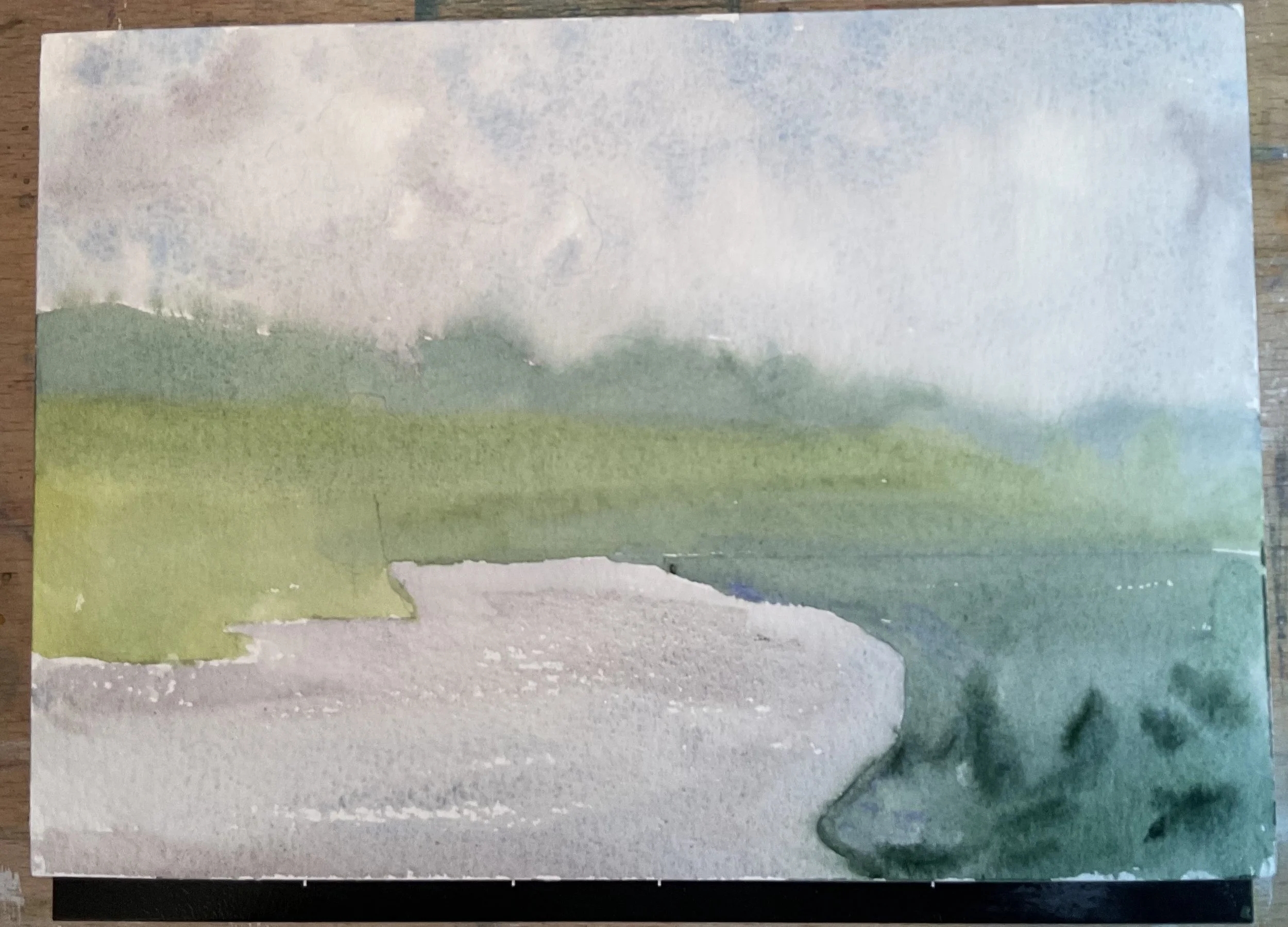 Starting with the sky, I’ve mixed up in the grays already in my palette some Cerulean and lavender, being careful not to overmix it. By leaving it in blotches, we can use it to achieve the different colors in the sky. I really love how this paper is picking up the granulation of the Cerulean and creating the texture I see in the oil reference. I’m going to give that just a few seconds to dry, not too much because I don’t want cauliflowers, and then I am going to work my way down the landscape into the line of distant hills. I do want that horizon line to stay soft so if the sky has dried too much you can come back in and soften the edges here and there with a damp brush. I’m always adding a bit of blue or a different green to the mixture so that we don’t have one big block of uninteresting green. This distant land can be bluer than the rest since it is further away. I didn’t get the shade right the first time but that is ok, because we are making it much darker later. Carry those greens down into the field, add some darker green and lavender, and the trees on the left. I should have done my water when I did my sky, but once again, no worries, adding it in now and getting soft edges by the shore is fine because we want those anyway. Plus, we can add in the reflections of the trees we will be painting in the next layer. Here’s what we have after that first wash.