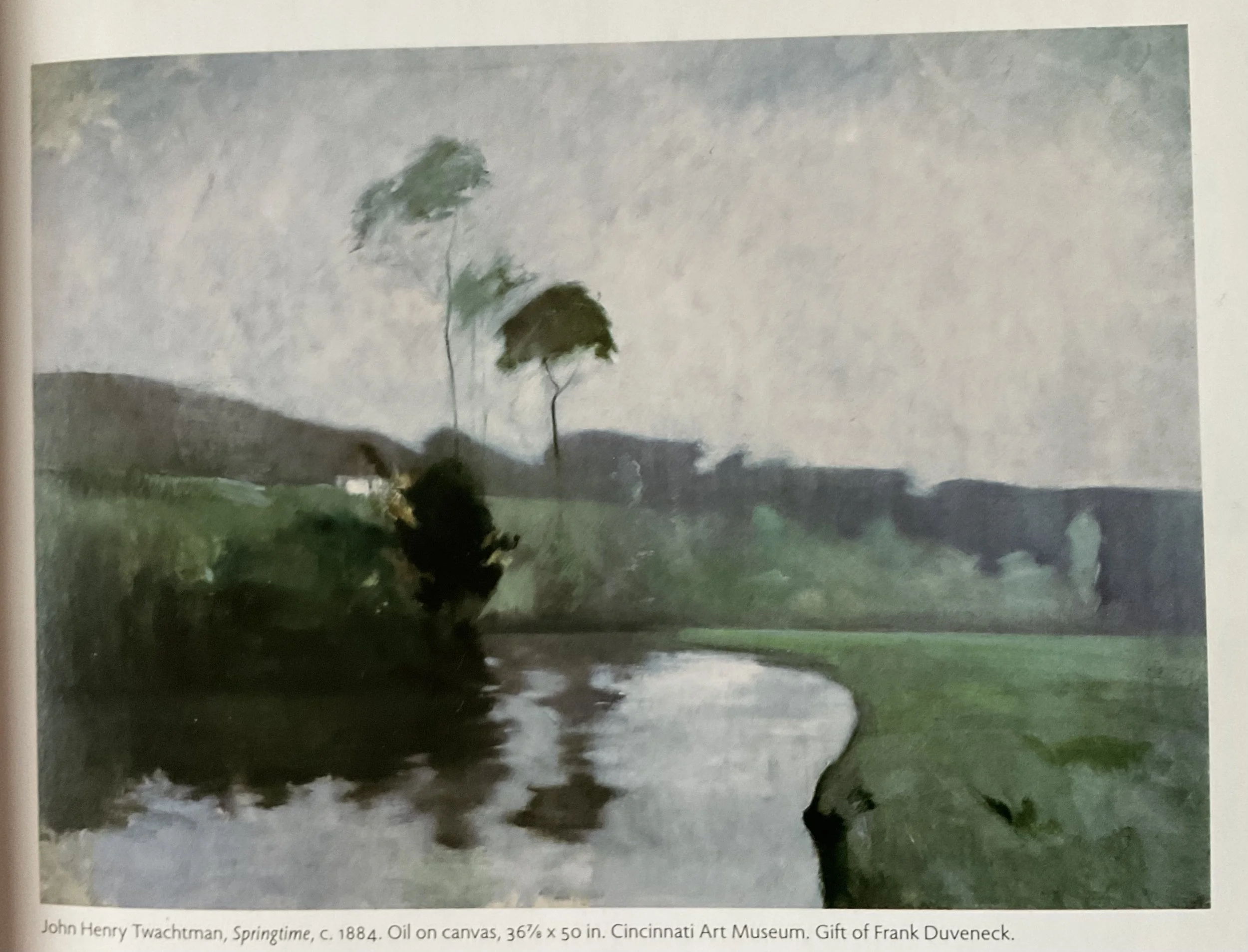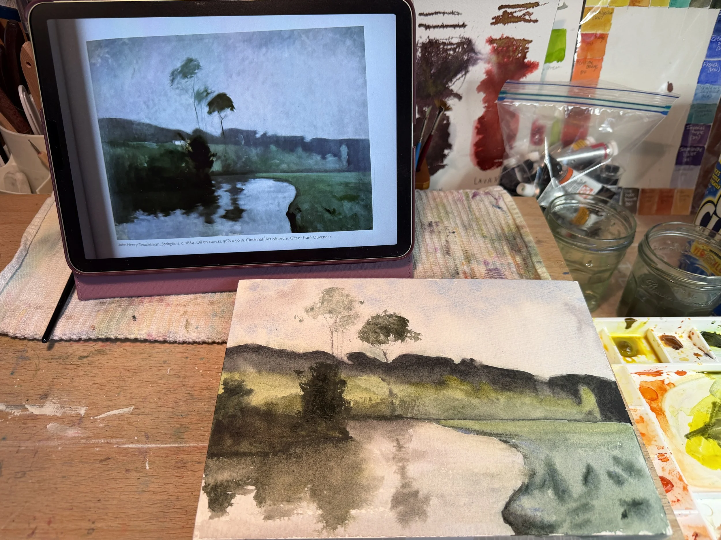 The first rule of Tonalism is the “the use of subtle color tones coprised of various greens, purples, blues and grays that are restful and easy on the eyes.” To illustrate this I have chosen to paint John Henry Twachtman’s Springtime. This painting should be much easier to accomplish in watercolor as it is very soft and even the darks have soft edges. I will be using the greens and browns from my palette along with some cobalt, ultramarine, and lavender. This time I am painting on NY Central Art Supply 300lb cotton paper. My first time using their 300lb. It’s also a 7x10 since painting super small was just not an easy thing for me to do and trying to overcome that hurdle is NOT the point of this experience.